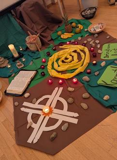 Eine farbenfroh dekorierte Mitte gehört zu jedem Gottesdienst beim Weltgebetstag der Frauen