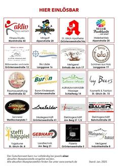 Sie suchen ein Geschenk für Ostern, zum Geburtstag oder zu anderen besonderen Anlässen? Dann ist der Wertacher Wertgutschein genau das Richtige. Diesen Gutschein gibt es im Wert von 10,- €, 15.- € und 25,- €, kann in teilnehmenden Wertacher Geschäften eingelöst werden und ist in der Tourist-Info Wertach erhältlich.