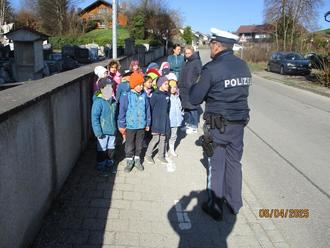 Gemeinsam mit Herr Schlachter von der Polizei Immenstadt durften alle Vorschulkinder den Schulweg ablaufen. Herr Schlachter erklärte uns das richtige Verhalten als Fußgänger im Straßenverkehr.