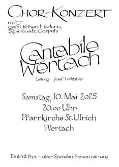 Am Samstag, den 10. Mai 2025, lädt der Chor Cantabile aus Wertach zu seinem diesjährigen Jahreskonzert ein. Beginn ist um 20 Uhr in der Pfarrkirche St. Ulrich.