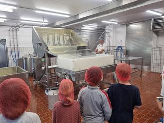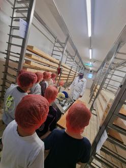 Zuerst mussten wir Haarnetze und einen Plastikschutz über die Füße für die Hygiene anziehen. Jetzt wurde uns gezeigt, wie Käse hergestellt wird. Es hat überall stark nach Käse gerochen. Wir erfuhren, dass der Weißlacker ein Jahr reifen muss. Als nächstes durften wir Kinder die Molke probieren. Das hat süß und lecker geschmeckt! Auch wurde uns die Kühlkammer und wie man Käse mit Salzwasser säubert gezeigt.