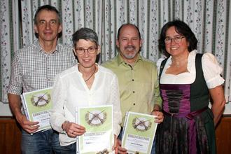 Die Schützenmeisterin (r.) freut sich mit den Geehrten: Stolz präsentieren Armin Graf (l.), Sabine Führer-Hauber und Mario Hengge ihre Auszeichnungsurkunden für 40 Jahre Mitgliedschaft im Schützenverein.