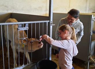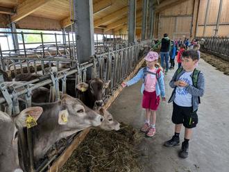 Auf dem Hof angekommen, wurden wir herzlich begrüßt. Zuerst durften wir die Kühe und Kälbchen im Stall besuchen. Es war sehr interessant zu sehen, wie die Tiere dort leben. Besonders aufregend war das Wettmelken, bei dem wir selbst ausprobieren durften, wie man eine Kuh melkt – das war gar nicht so einfach, hat aber viel Spaß gemacht!
