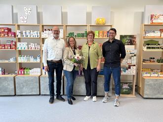 Die Erste Bürgermeisterin Gertrud Knoll gratulierte den Eheleuten Dr. Müller-Faßbender zur Übernahme der St. Ulrich-Apotheke recht herzlich und wünschte den Eheleuten Dr. Müller-Faßbender sowie Herrn Andreas Braun, der die Betreuung der Filiale vor Ort übernimmt und dem gesamten Team viel Erfolg und Freude.