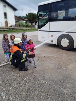 Die Kinder durften selbst einen Feuerwehrschlauch halten und Wasser spritzen – ein Riesenspaß!