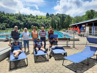 Neu im Freibad haben sich 10 Badeliegen eingefunden - wie man sieht, liegt man gut. Die alten, aber durchaus beliebten Badeliegen haben ausgedient. Jetzt stehen bequeme Liegen inklusivem schützendem Sonnendach zur Verfügung, die an der Kasse gegen Pfad und einer Leihgebühr ausgeliehene werden können.
