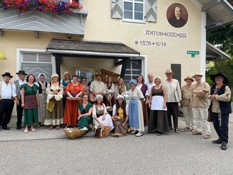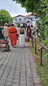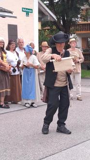 Schön war´s! Der Neustart nach fünf Jahren. Die Freude darüber merkte man den rund 20 Laiendarstellenden während des 1,5-stündigen historischen Ortsrundgangs auch an. Und auch die rund 30 Gäste aus nah und fern waren begeistert über die kurzweilige Führung, die am Weißlackerplatz startete. Weiter ging´s zum Kurpark, an dem sich noch ein Trommler anschloss und die Gruppe bis zum während des furchtbaren Brandes im Jahr 1893 stehengebliebenen Guggemoos Hauses lautstark begleitete. Kurzer Halt am Schimmelreiterhaus und weiter in die St. Ulrich Kirche hinein, in der die Schauspielgruppe wieder wunderschöne Lieder sang.