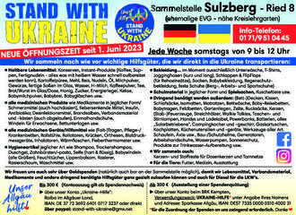 Wir „STAND WITH UKRAINE | Das Allgäu hilft!“ als rein private Hilfsorganisation versichern Ihnen, dass alle Sach- und Geldspenden ausschließlich für die vom Krieg betroffenen Menschen absolut sinnvoll und nach direktem Bedarf übergeben werden. Info-Telefon: 0171/9510445, ab 15 Uhr. Wir freuen uns auch sehr über Geldspenden (natürlich auch bar an der Sammelstelle möglich), damit wir Lebensmittel, Verbandsmaterial, Medikamente, Windeln (für Kinder und Erwachsene) und andere dringend benötigte Hilfsgüter ganz gezielt und nach Bedarf zukaufen können und auch für den Diesel für die LKWs.