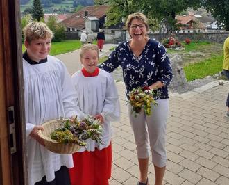 Auch in Wertach waren viele fleißige Hände am Werk: Die Ministranten banden unter Anleitung von Mesnerin Sylvia Sigl und einigen Mamas zahlreiche Kräuterbuschen. Dabei galt es einiges zu beachten: In jeden Strauß soll nach Möglichkeit eine Rose als Symbol für die Gottesmutter Maria – um die es an Mariä Himmelfahrt schließlich geht. In die Mitte kommt traditionell eine Königskerze. Außerdem soll die Anzahl der Kräuter in jedem Strauß durch eine göttliche Zahl teilbar sein. Verarbeitet wurde alles, was zurzeit in der Natur wächst und heilsam ist: Kamille, Malve, Ysop, Schafgarbe, Ringelblume, Salbei, Beifuß, Minze und vieles mehr. Den Minis machte das Binden richtig Spaß und so waren nach eineinhalb Stunden alle gesammelten Kräuter und Blumen verarbeitet. Im Gottesdienst durften sich die Besucher dann gegen eine Spende die wunderbar duftenden, geweihten Sträuße mit nach Hause nehmen.