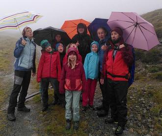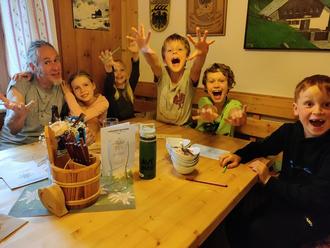 Am Sonntag morgen war dann irgendwie die Luft raus. Wahrscheinlich hatten wir einfach zu viel Zeit in der Hütte gesessen, zu viel Kaiserschmarrn und Apfelstrudel verputzt... Das Wetter war wieder nicht eindeutig vorhersehbar. Nasse Schuhe, schniefende Nasen und die Sorge nach noch mehr Regen trieben uns auf dem direkten Weg ins Tal. Die Hüttenwirtin hatte Mitleid mit uns und schickte die Rucksäcke mit der Materialseilbahn nach unten. So lief es sich leichter bergab, und in der Rückschau überwiegt hoffentlich bei allen Beteiligten die schöne Zeit mit viel Spielen und Lachen zusammen!