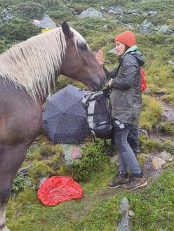 Highlight des Tages war dann eine Herde von sechs Pferden, die unverhofft aus dem Nebel auftauchten und – nach anfänglicher Scheu – fast schon aufdringlich den Kontakt zu uns suchten. Wollten Sie etwas Essbares aus unseren Rucksäcken ergattern? Oder haben sie sich einfach nur gefreut, bei dem Sauwetter überhaupt jemandem zu begegnen?