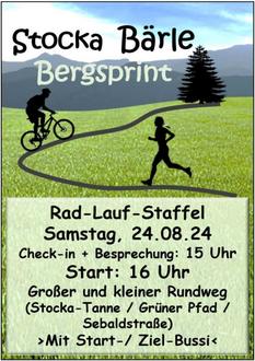 Am Samstag, den 24.08.2024 findet am Ortsrand von Wertach der erste „Stocka Bärle Bergsprint“ statt. Der Wettkampf wird als Rad-Lauf-Staffel ausgetragen und die ca. 15 angemeldeten Teams bestehen aus Wertacher „Bärle“ (Dialekt für Paare, Ehepaare, Partnerschaften, etc.).