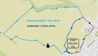 Dieser Staffel-Rundkurs wird von jedem Teilnehmer insgesamt 3 Mal absolviert, d.h. der Radfahrer beendet den Wettkampf nach seiner 3. Runde und wird vom Läufer mit einem Ziel-Bussi und einem Finisher-Bier empfangen.