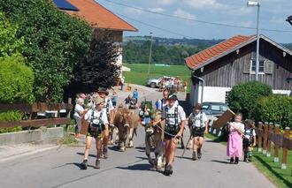 Aufgeregt und voller Vorfreude waren die Junghirten bereits am frühen Morgen und konnten den Start ihres Viehscheids "Enthalb der Ach" am Nachmittag kaum erwarten. Mit neun Stück Jungvieh trieben die sechs Hirten die Herde durch den Wertacher Ortsteil, angeführt mit einem "Täfele" mit Hinweis auf die Alpe Hintere Halde, gefolgt von einem geschmückten Kranzrind.