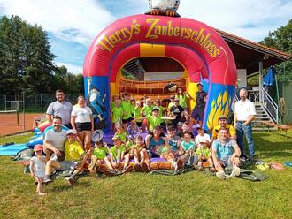 An den zwei Tagen gab es drei Blöcke zu je drei Stunden Tennistraining, wobei alle Sandplätze und die Schlagwand für verschiedene Übungsformen zum Einsatz kamen. Neben tennisspezifischen Aufgaben konnten die Kids sich aber auch bei einer „Biathlonstaffel“ messen oder die von Sponsor Fabian Klemmer (Allianz Versicherung) zur Verfügung gestellte Hüpfburg ausgiebig testen. Dieser sponserte gemeinsam mit Markus Dobler (Sachverständigenbüro Dobler) auch für alle Kinder ein Tenniscamp T-Shirt, welches zu Beginn des Camps an alle ausgeteilt wurde. DANKE!