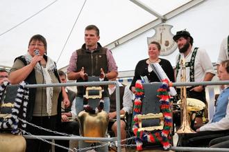 Zweite Bürgermeisterin Gudrun Steiner und der Bauleiter der Fa. Grünbau, Herr Raßloff, welche die Ehrenschelle dieses Jahr stiftete, bedankten sich für die gute Zusammenarbeit mit der Gemeinde, der Alpgemeinschaft und dem Pfeifenclub. Steiner nannte drei Schlagworte zur „Zeitenwende“: zum einen die Alphirtfamilie; zweitens, dass dieses Jahr wieder gefeiert werden darf und drittens wegen dem Alpvieh. Denn ohne Alpwirtschaft ist der Tourismus im Allgäu nicht mehr das, was er sein sollte und vor allem gehe die Alpwirtschaft nur ohne Wolf: „Helft uns unsere Alpwirtschaft und das Vieh sicher zu halten.“