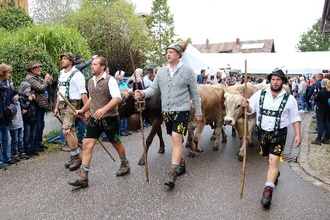 Im Ort wartete die Harmoniemusik Oy, die den Zug der Tiere mit seinen Betreuern traditionell durch das Festzelt zum Scheidplatz führte. Die Besucher sahen den Zug der Tiere ohne das Kranzrind, da heuer ein Rind verunglückte und nicht mit von der Alpe zurückkehrte.