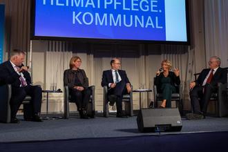 In der Gesprächsrunde v.l.n.r.: Landesheimatpfleger Dr. Neumaier, Yvonne Löken, Gymnasium Landshut, Staatsminister Füracker, Petra Maria Heinle, Prof. Dr. Dippold (stv. Vorsitzender des Landesvereins für Heimatpflege e. V.)