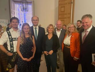 Beim Empfang v.l.n.r.: Maximilian Merz, Julia Heinle, Staatsminister Füracker, Petra Maria Heinle, Bezirksheimatpfleger Lang, Gabi Schmidt (MdL, Ehrenamtsbeauftragte im stmas), Landesheimatpfleger Dr. Neumaier