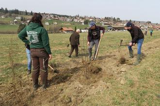 Studierende der Landwirtschaftsschule Kempten pflanzen eine Hecke. Wer solche Hecken für mehr Biodiversität in der Landwirtschaft anlegt, kann dafür Fördergelder beantragen.