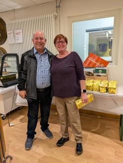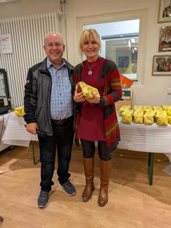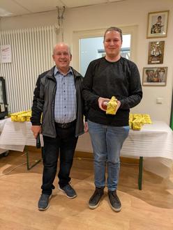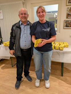Über den 1. Platz bei der freistehenden Damenklasse freute sich Marlene Blenk, Hermann Herzog überreichte ihr Käse und Wildsalami.