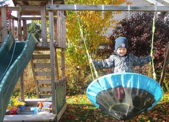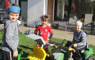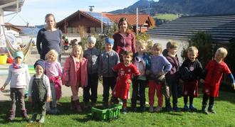 Unterwegs gab es viel zu entdecken: raschelnde Blätter, letzte Rosenblüten und sogar ein paar eingewachsene Wanderstiefel, die mit Moos und Hauswurz bewachsen waren, entdeckten wir in einem Vorgarten. Gut gelaunt erreichten alle schließlich Hannes’ Garten, wo es reichlich Spiel und Spaß gab. Schaukeln, rutschen, Hasen beobachten, Trampolin hüpfen und gemeinsames Lachen standen auf dem Programm.