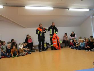Zwei Kindergartenpapas aus der Feuerwehr besuchten uns Krippen- und Kindergartenkinder. Wir sprachen mit ihnen gemeinsam darüber, wann wir die Feuerwehr brauchen.