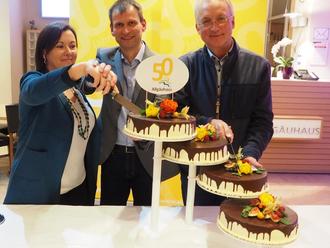 Auf den offiziellen Teil folgt die Feier: Die Mitglieder des Vorstands des Trägervereins Katja Weh-Gleich, Robert Hitzelberger und Diözesanpräses Wolfgang Kretschmer eröffnen das Kuchenbuffet mit Jubiläumstorte