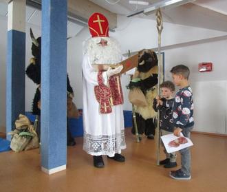 Wir versammelten uns gemeinsam in der Turnhalle, wo wir den Nikolaus mit einem fröhlichen Nikolauslied und einem Fingerspiel begrüßten. Er hörte aufmerksam zu, lobte die Kinder und richtete an jede Gruppe ein paar warme, freundliche Worte. Zur großen Freude aller verteilte der Nikolaus Säcke mit Nüssen, Mandarinen und weiteren Leckereien.