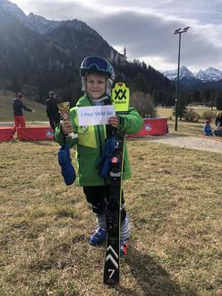 Gleich doppelten Grund zur Freude hatte Fabian Koch. Er gewann nicht nur einen Pokal für seinen 3. Platz in der Klasse U7 männllich, sondern auch noch den Hauptgewinn: einen neuen Völkl Ski, gesponsert von Armins Sporthäusle.