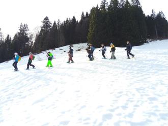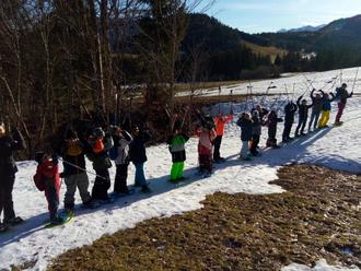 Am ersten Tag stand Schneeschuhwandern auf dem Programm. Nachdem die erste Hürde mit Anziehen der Schneeschuhe genommen wurde, stapften 21 Kinder motiviert den Hang am Spieserlift hinauf. Bald schon wurde es steiler und anstrengender. Der Schnee war hart, der Berg sehr steil, doch halfen sich die Kinder gegenseitig den Brotzeitplatz am Berg zu erreichen. In der Sonne genossen alle den Ausblick. Gestärkt schafften alle noch ein paar Höhenmeter, um dann fröhlich schlitternd den Berg wieder hinabzulaufen und sich mit Tee und Keksen vom Elternbeirat zu belohnen.