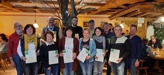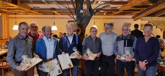 v. l.: Michael Sommer (50 Jahre), Herrmann Knoll (1. Vors.), Wendl Burkhardt u. Arnold Hafenrichter (beide 65 Jahre), Franz Bögle (60 Jahre), Gerhard Jörg (50 Jahre), Benno Eberle (60 Jahre), Sabine Houdek (2. Vorsitzende)