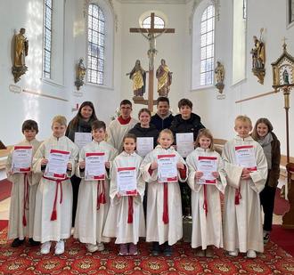Traditionell wurden am Christkönigssonntag, den 24.11.2024 langjährige Ministrantinnen und Ministranten im Rahmen eines feierlichen Gottesdienstes in der Pfarrkirche St. Peter u. Paul in Aufkirch eingeführt und verabschiedet. Pfarrer Kreuzer bedankte sich bei den Jugendlichen für ihren jahrelangen Dienst.