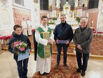 Am Schluss der Vorabendmesse am 15.02.2025 wurden die bisherigen Kirchenverwaltungsmitglieder Alois Inning, Thalhofen (für 30 Jahre Tätigkeit in der Kirchenverwaltung) und Andrea Schmid, Stöttwang (für 6 Jahre KV) von Pfarrer Julius Kreuzer und Kirchenpfleger Richard Ficker mit Dankesworten und einem Geschenk sowie dem Applaus der Kirchengemeinde verabschiedet.