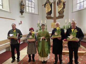 Am 23.02.2025 wurden nach dem Gottesdienst die ausgeschiedenen Mitglieder der Kirchenverwaltungen Aufkirch, Blonhofen und Helmishofen feierlich verabschiedet. Herr Pfarrer Julius Kreuzer bedankte sich bei Josef Filser für 12 Jahre davon 6 Jahre als Kirchenpfleger, bei Anna Rieger für 24 Jahre, Josef Zwick für 12 Jahre und Josef Kramer für 42 Jahre geleistete Arbeit."