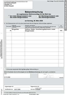 Die Anlagen zu den Bekanntmachungen der zugelassenen Wahlvorschläge werden ortsüblich ausgehängt.
