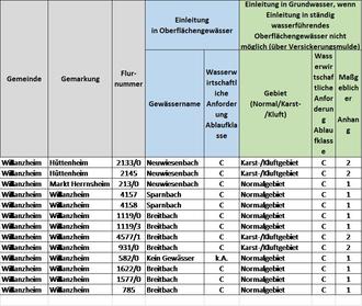 Die in der folgenden Liste aufgeführten Grundstücke im Markt Willanzheim werden als bezeichnete Gebiete gem. Art. 70 Abs. 1 Satz 1 Nr. 2 BayWG ausgewiesen. Es gelten die jeweiligen Anforderungen an die Abwasserbeseitigung gemäß der Liste und dem aufgeführten maßgeblichen Anhang.