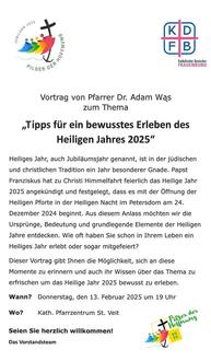 | PFZ | 19:00 | KDFB, Vortrag zum Thema: „Tipps für ein bewusstes Erleben des Heiligen Jahres 2025“, Referent: Pfr. Dr. Adam Was |