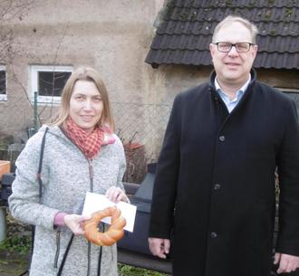 Bei dieser Gelegenheit überreichte Bürgermeister Michael Dörr an Frau Heidi Jank, stellvertretend für die Heimleitung und die Mitarbeiter ebenso wie für die Bewohnerinnen und Bewohner, 120 frisch gebackene Neujahrsringe und einen schriftlichen Neujahrsgruß.