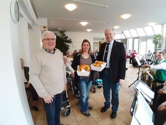 Bei dieser Gelegenheit überreichte 2. Bürgermeister Schlackl an Frau Heidi Jank, stellvertretend für die Heimleitung und die Bediensteten des Hauses ebenso wie für die Bewohnerinnen und Bewohnern traditionell die von der Stadt gesponserten Neujahrsringe. Er bedankte sich zunächst beim Musikverein, der sich erneut zu diesem Konzert bereiterklärt hat, und beim Personal des Hauses für die geleistete Arbeit im vergangenen Jahr 2023. Der 2. Bürgermeister stellte dabei fest, dass das BRK Senioren – Wohnen in Wolframs – Eschenbach weit über die Grenzen der Stadt hinaus einen sehr guten Ruf besitzt, was die rege Nachfrage nach Heimplätzen beweist.