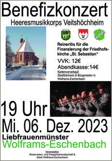Kommen Sie vorbei, genießen Sie die Pause vom Alltag und lassen Sie sich am Mittwoch, den 06. Dez. 2023 um 19 Uhr bei einem Vorweihnachtskonzert im Liebfrauenmünster Wolframs-Eschenbach begeistern. In Zusammenarbeit und Absprache des Musikkorps und der Reservisten- und Kriegerkameradschaft sowie der Stadt Wolframs-Eschenbach ist die Idee zum Konzert „entstanden“. Der Reinerlös ist für die Finanzierung der Friedhofskirche „St. Sebastian“ angedacht.
