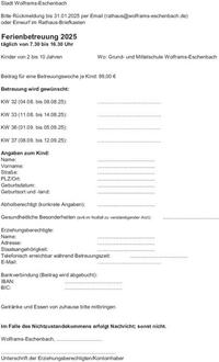 Alle interessierten Eltern werden gebeten, ihre Kinder bis spätestens 31.01.2025 mittels beiliegendem Anmeldeformular verbindlich anzumelden. Buchbar sind nur ganze Wochen.