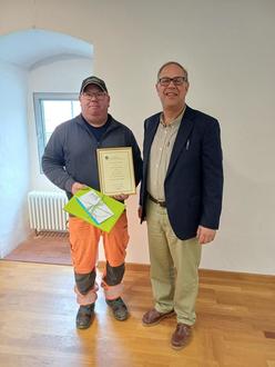 Vor kurzem konnte unser Vorarbeiter im Bauhof Herr Harald Zeller sein 25-jähriges Dienstjubiläum feiern. Als Dank und Anerkennung für die hervorragende geleistete Arbeit im letzten Vierteljahrhundert übereichte der 1. Bürgermeister Michael Dörr Herrn Zeller eine Urkunde und ein kleines Präsent und wünschte weiterhin alles Gute für die berufliche Laufbahn bei der Stadt Wolframs-Eschenbach.