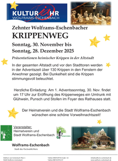 Herzliche Einladung: Am 1. Adventssonntag, 30. Nov. findet um 17.00 Uhr zur Eröffnung des Krippenweges ein Umtrunk mit Glühwein, Punsch und Stollen im Foyer des Rathauses statt.