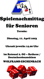 Mit Unterstützung des Krankenpflegevereins finden jeweils am zweiten Dienstag im Monat in der Zeit von 14.00 bis ca. 17.00 Uhr im Ratssaal des Bürgerhauses für Senioren öffentliche Spielenachmittage statt. Die Spielenachmittage werden gut angenommen. Gleichwohl würden wir uns über weitere Gäste freuen.