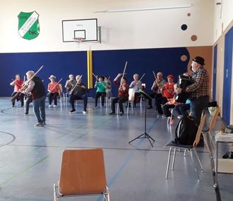 Aus gegebenen Anlass überraschten am Faschingsdienstag Hans Hertlein mit dem Schifferklavier und Georg Achinger mit Besen und Löffel die Senioren – Gymnastikgruppe. Nachdem jeder Teilnehmer einen Kochlöffel selbst mitgebracht und einen Holzstab erhalten hatte, versuchte Georg Achinger den Senioren – Sportlern das Instrument Kilimatima beizubringen, die sich dabei im Gehschritt weiterbewegten. Mit Schunkel – Bewegungen und einer Polonaise wurde das Gymnastik – Übungsziel im vollen Umfange ebenfalls erfüllt, nur mit mehr Spaß.