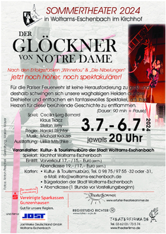 Bei der Stadtverwaltung (Frau Eder) und im Bürgerladen sind bereits Eintrittskarten für das Sommertheater „Der Glöckner von Notre Dame“ Jetzt noch höher, noch spektakulärer“ vom 03.07.- 06.07.2024 erhältlich!