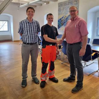 Am Montag, den 03.07.2023 begrüßten Verwaltungsleiter Stefan Beyerlein und Bürgermeister Michael Dörr den neuen Hausmeister für die Kindertagesstätte am Sportzentrum.