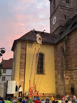 Im Zentrum der Inszenierung stand eine 12m hohe Feuerwehrleiter, sie bot Raum für spektakuläre Szenen und überwältigende Bilder.