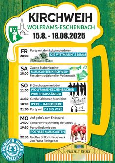 Der Kirchweihauftakt mit traditionellem Einsingen der Kerwabuam und Kerwamadli am Donnerstag, den 14. August 2025 wird wieder am Wolfram-von-Eschenbach-Denkmal stattfinden. Für das leibliche Wohl sorgt der Kirchweihverein. Musikalisch umrahmt wird der Auftakt in ganz besonderer Altstadt-Atmosphäre wieder durch die "Original Wolframs-Eschenbacher Musikanten".